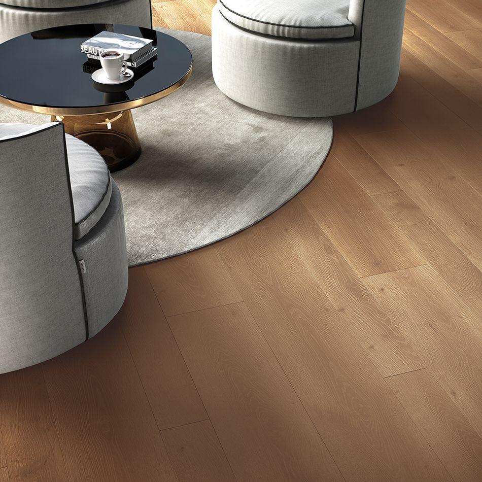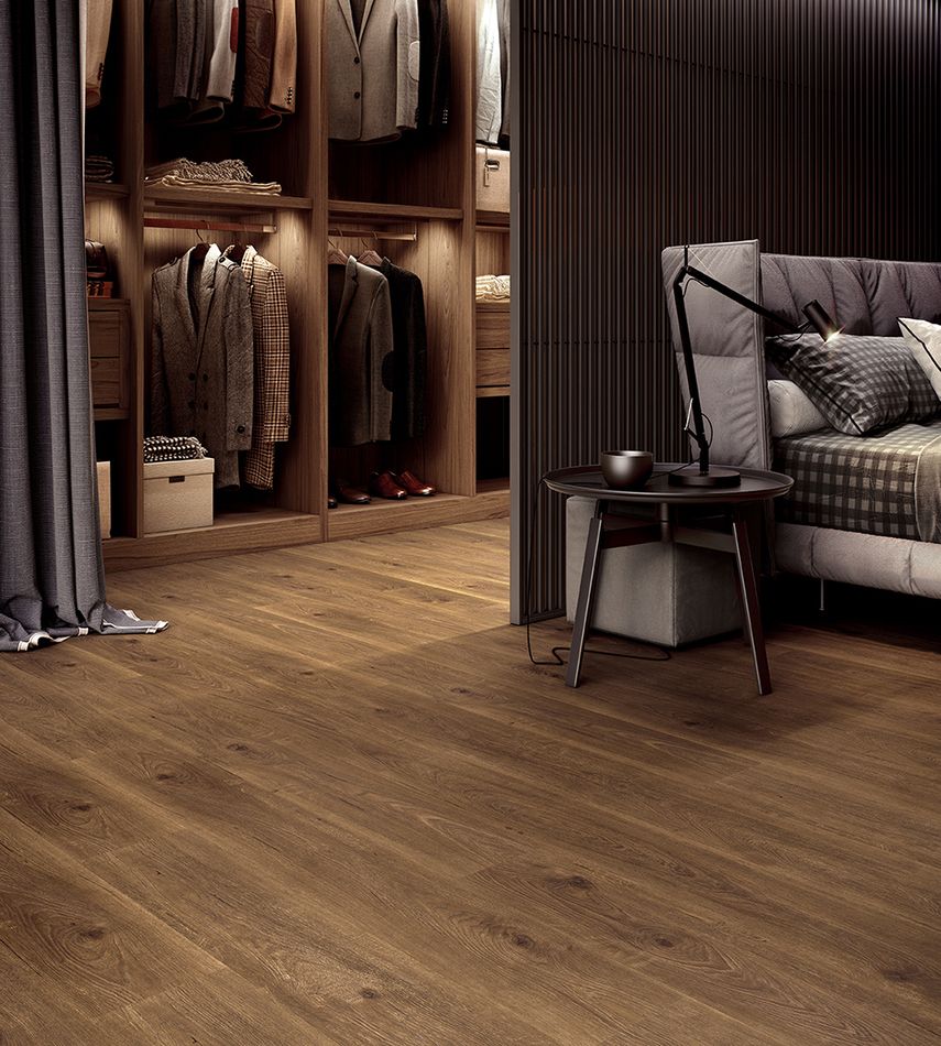 Punto fuerte: La combinación de lama ancha y larga. Aporta una personalidad única, imitando los suelos de madera noble de gran formato.